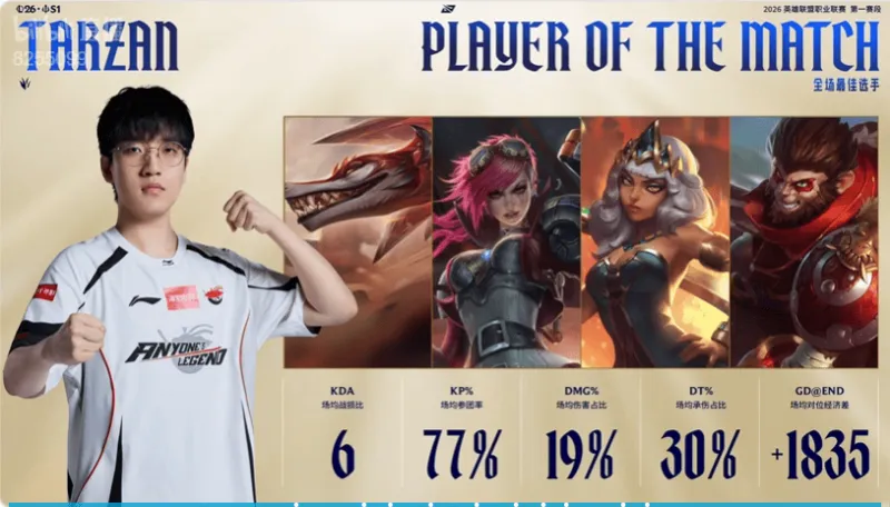 虎扑03月03日讯 Tarzan以77%的参团率当选AL对阵IG比赛的大场MVP